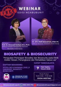 Let’s spend our time while waiting for fasting break with useful activity, by attending a free webinar on Strengthening the Implementation of Biosafety and Biosecurity for Veterinary Clinics, Captive Breeding and Rehabilitation Facility of Wild Animal”. The Topic will be delivered by Prof. Herawati Sudoyo and Dr. Diah Iskandriati, who are the President of Steering and Organizing Committee of ABI, respectively.
